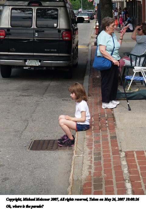 Picture #2: Ok, where is the parade? Thumb: 240x320, 30,016 bytes (30K) Small: 480x686, 78,815 bytes (77K), (html file) Copyright, Michael Meissner 2007, All rights reserved Olympus E-1 camera with Olympus 14-54mm f/2.8-3.5 lens f/5.6, ISO 100, 1/320 sec, 50.0mm, auto mode, SHQ, matrix metering, +2 sharpening 35mm equivalent focal length 100.0mm Programs used: rotate Taken by Michael Meissner on May 26, 2007 10:08:26 Last modified on May 26, 2007 at 10:08 |