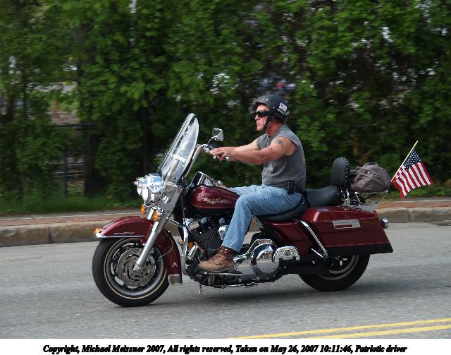 Picture #3: Patriotic driver Thumb: 320x240, 27,045 bytes (27K) Small: 640x503, 70,417 bytes (69K), (html file) Copyright, Michael Meissner 2007, All rights reserved Olympus E-1 camera with Olympus 14-54mm f/2.8-3.5 lens f/5.6, ISO 100, 1/250 sec, 37.0mm, auto mode, SHQ, matrix metering, +2 sharpening 35mm equivalent focal length 74.0mm Taken by Michael Meissner on May 26, 2007 10:10:14 Last modified on May 26, 2007 at 10:10 |