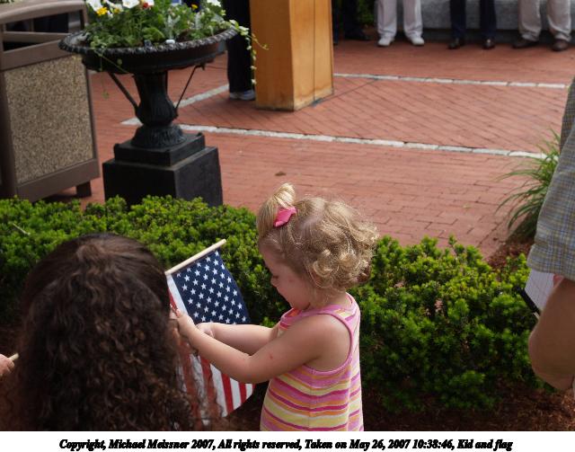 Picture #21: Kid and flag Thumb: 320x240, 28,851 bytes (29K) Small: 640x503, 68,993 bytes (68K), (html file) Copyright, Michael Meissner 2007, All rights reserved Olympus E-1 camera with Olympus 14-54mm f/2.8-3.5 lens f/5.6, ISO 100, 1/200 sec, 32.0mm, auto mode, SHQ, matrix metering, +2 sharpening 35mm equivalent focal length 64.0mm Taken by Michael Meissner on May 26, 2007 10:38:46 Last modified on May 26, 2007 at 10:38 |