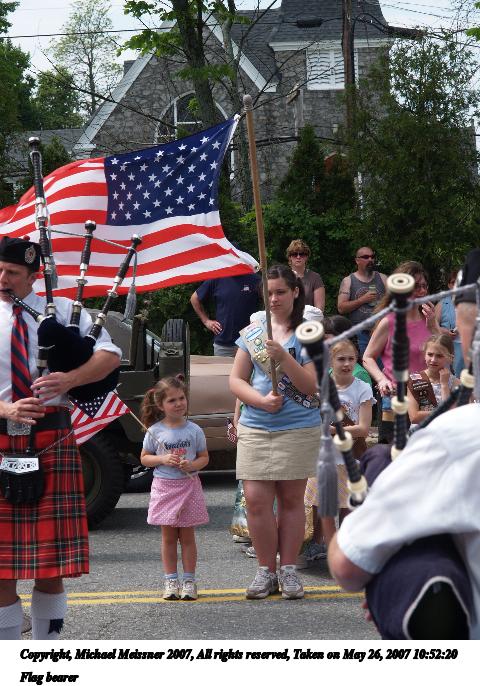 Picture #29: Flag bearer Thumb: 240x320, 38,177 bytes (38K) Small: 480x686, 96,738 bytes (95K), (html file) Copyright, Michael Meissner 2007, All rights reserved Olympus E-1 camera with Olympus 14-54mm f/2.8-3.5 lens f/5.6, ISO 100, 1/320 sec, 54.0mm, auto mode, SHQ, matrix metering, +2 sharpening 35mm equivalent focal length 108.0mm Programs used: rotate Taken by Michael Meissner on May 26, 2007 10:52:20 Last modified on May 26, 2007 at 10:52 |