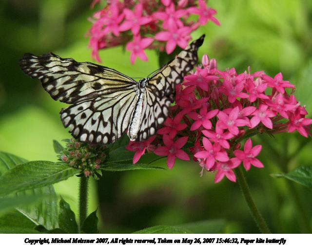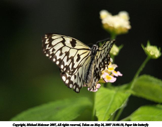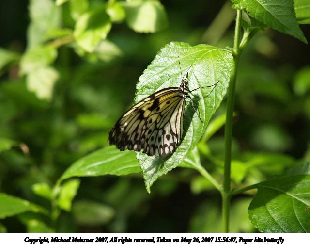Picture #17: Paper kite butterfly #2 Thumb: 320x240, 25,908 bytes (26K) Small: 640x503, 56,798 bytes (56K), (html file) Copyright, Michael Meissner 2007, All rights reserved Olympus E-1 camera with Olympus 50-200mm f/2.8-3.5 lens f/4.0, ISO 200, 1/320 sec, 137.0mm, auto mode, SHQ, matrix metering, +2 sharpening 35mm equivalent focal length 274.0mm Taken by Michael Meissner on May 26, 2007 15:56:07 Last modified on May 26, 2007 at 15:56 |