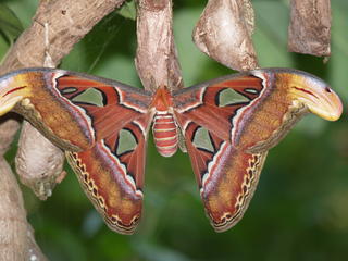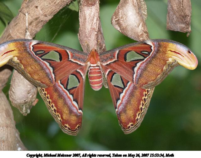 Picture #14: Moth Thumb: 320x240, 28,439 bytes (28K) Small: 640x503, 74,972 bytes (74K), (html file) Copyright, Michael Meissner 2007, All rights reserved Olympus E-1 camera with Olympus 50-200mm f/2.8-3.5 lens f/3.5, ISO 200, FL-50 flash, 1/160 sec, 200.0mm, auto mode, SHQ, matrix metering, +2 sharpening 35mm equivalent focal length 401.0mm Extra equipment used: FL-50 flash Taken by Michael Meissner on May 26, 2007 15:53:34 Last modified on May 26, 2007 at 15:53 This is the largest moth in the world. When I looked at the moth in person, it wasn't that colorful, but when my flash was used the colors really came out. |