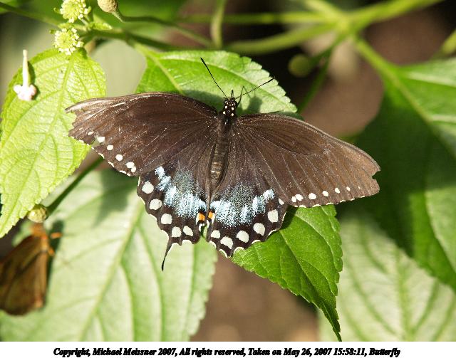 Picture #11: Butterfly #9 Thumb: 320x240, 21,389 bytes (21K) Small: 640x503, 47,128 bytes (47K), (html file) Copyright, Michael Meissner 2007, All rights reserved Olympus E-1 camera with Olympus 50-200mm f/2.8-3.5 lens and Olympus EX-25 (macro) f/4.0, ISO 200, 1/250 sec, 200.0mm, auto mode, SHQ, matrix metering, +2 sharpening 35mm equivalent focal length 401.0mm, EX-25 Taken by Michael Meissner on May 26, 2007 15:47:31 Last modified on May 26, 2007 at 15:47 |