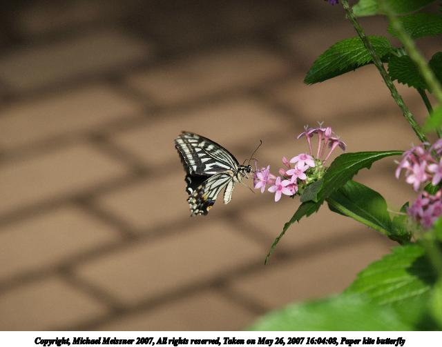 Picture #10: Paper kite butterfly Thumb: 320x240, 28,320 bytes (28K) Small: 640x503, 63,281 bytes (62K), (html file) Copyright, Michael Meissner 2007, All rights reserved Olympus E-1 camera with Olympus 50-200mm f/2.8-3.5 lens and Olympus EX-25 (macro) f/4.5, ISO 200, 1/320 sec, 200.0mm, auto mode, SHQ, matrix metering, +2 sharpening 35mm equivalent focal length 401.0mm, EX-25 Taken by Michael Meissner on May 26, 2007 15:46:32 Last modified on May 26, 2007 at 15:46 |