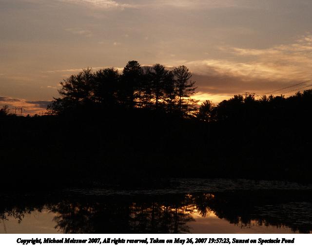 Picture #9: Sunset on Spectacle Pond Thumb: 320x240, 19,019 bytes (19K) Small: 640x503, 42,810 bytes (42K), (html file) Copyright, Michael Meissner 2007, All rights reserved Olympus E-1 camera with Olympus 14-54mm f/2.8-3.5 lens f/8.0, ISO 200, 1/640 sec, 54.0mm, auto mode, SHQ, spot metering, +2 sharpening, Exposure bracketing (shot 1) 35mm equivalent focal length 108.0mm Taken by Michael Meissner on May 26, 2007 19:57:23 Last modified on May 26, 2007 at 19:57 |