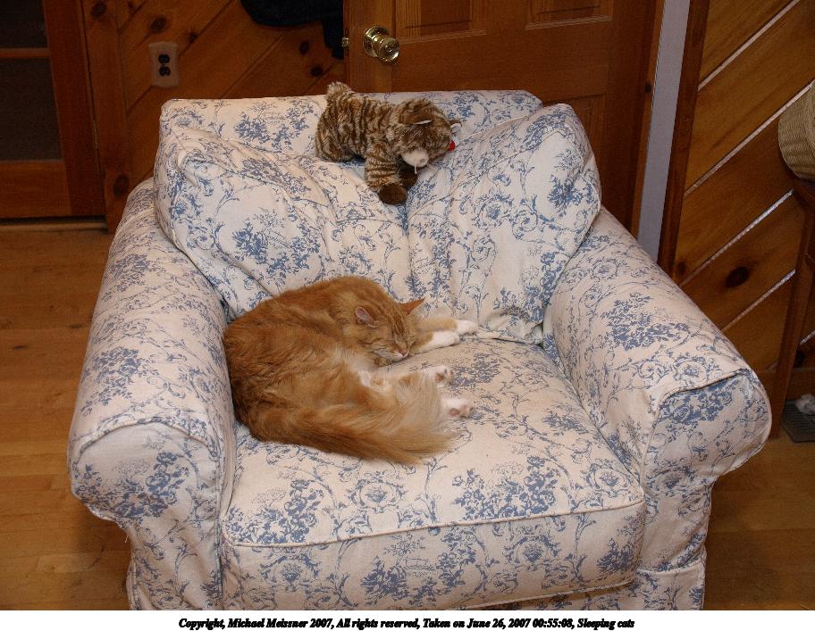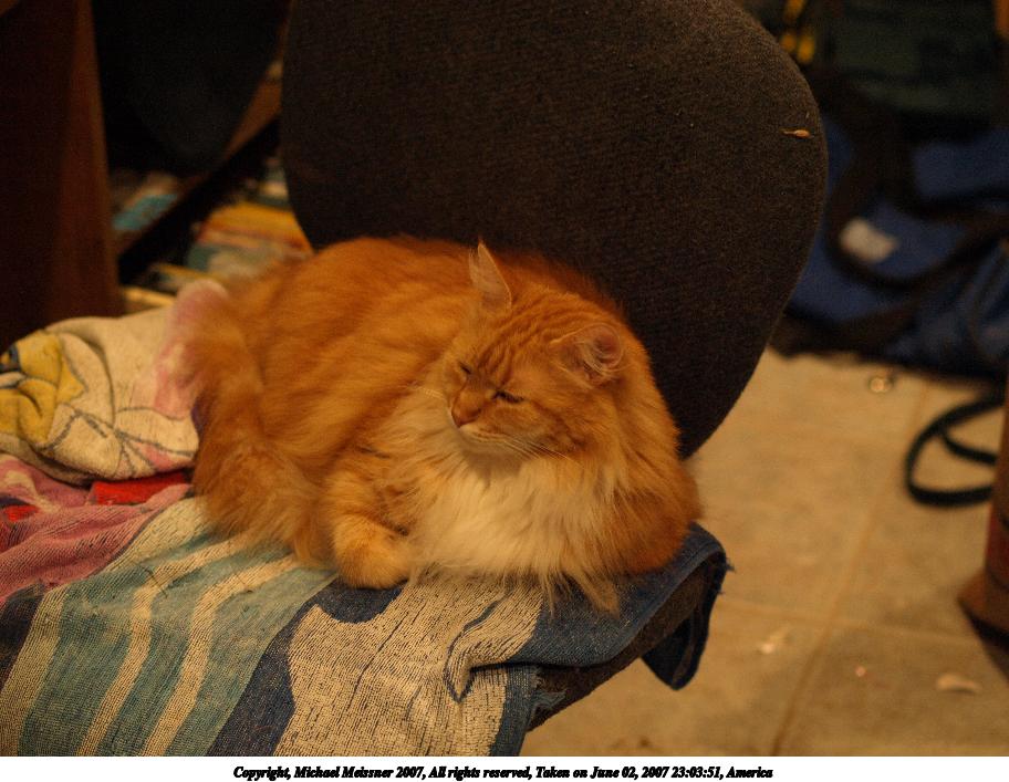 Picture #10: Sleeping cats Thumb: 456x342, 46,387 bytes (46K) Small: 912x707, 149,195 bytes (146K), (html file) Copyright, Michael Meissner 2007, All rights reserved Olympus E-510 camera with Olympus 14-54mm f/2.8-3.5 lens f/3.1, ISO 200, FL-50 flash, 1/50 sec, 25.0mm, auto mode, vivid color, SHQ, matrix metering, -2 sharpening, image stabilization 35mm equivalent focal length 50.0mm Extra equipment used: FL-50 flash, Flip-it Taken by Michael Meissner on June 26, 2007 00:55:08 Last modified on June 26, 2007 at 00:55 This picture is one of my favorites. |