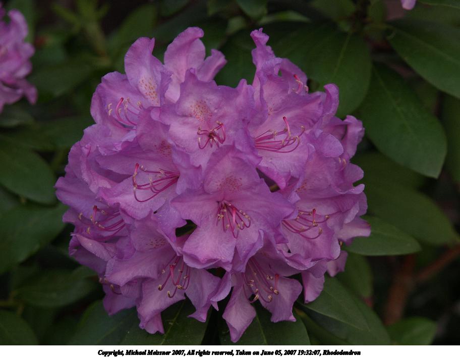 Picture #2: Rhododendron Thumb: 456x342, 33,456 bytes (33K) Small: 912x707, 75,771 bytes (74K), (html file) Copyright, Michael Meissner 2007, All rights reserved Olympus E-510 camera with Olympus 14-54mm f/2.8-3.5 lens f/3.5, ISO 100, 1/125 sec, 54.0mm, auto mode, natural color, SHQ, matrix metering, image stabilization, noise filter low 35mm equivalent focal length 108.0mm Taken by Michael Meissner on June 05, 2007 19:32:07 Last modified on June 05, 2007 at 19:32 |