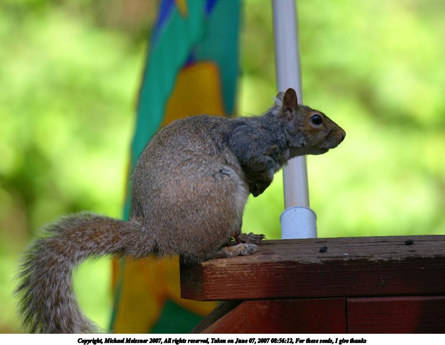 Picture #1: For these seeds, I give thanks Thumb: 456x342, 36,206 bytes (36K) Small: 912x707, 81,905 bytes (80K), (html file) Copyright, Michael Meissner 2007, All rights reserved Olympus E-510 camera with Olympus 50-200mm f/2.8-3.5 lens f/3.5, ISO 100, 1/200 sec, 200.0mm, auto mode, natural color, SHQ, matrix metering, image stabilization, noise reduction, noise filter low, auto focus right 35mm equivalent focal length 401.0mm Programs used: gimp Taken by Michael Meissner on June 07, 2007 08:56:12 Last modified on June 07, 2007 at 08:56 This picture is one of my favorites. |