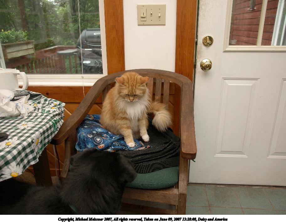 Picture #8: Daisy and America Thumb: 456x342, 41,692 bytes (41K) Small: 912x707, 104,456 bytes (103K), (html file) Copyright, Michael Meissner 2007, All rights reserved Olympus E-510 camera with Olympus 14-54mm f/2.8-3.5 lens f/2.8, ISO 100, FL-50 flash (+0.7 flash compensation), 1/30 sec, 14.0mm, auto mode, natural color, SHQ, matrix metering, image stabilization, noise reduction, noise filter low 35mm equivalent focal length 28.0mm Extra equipment used: FL-50 flash Programs used: gimp Taken by Michael Meissner on June 09, 2007 13:28:08 Last modified on June 09, 2007 at 13:28 |
