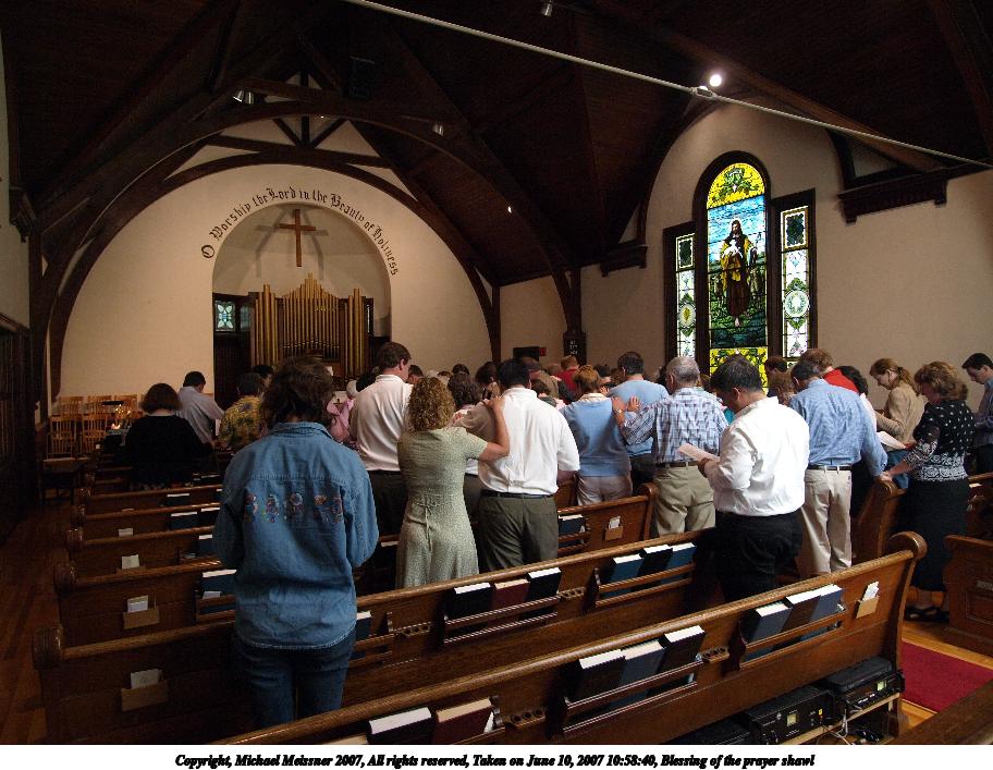 Picture #15: Blessing of the prayer shawl #2 Thumb: 456x342, 45,937 bytes (45K) Small: 912x707, 131,468 bytes (129K), (html file) Copyright, Michael Meissner 2007, All rights reserved Olympus E-510 camera with Olympus 11-22mm f/2.8-3.5 lens f/3.2, ISO 800, 1/40 sec, 11.0mm, auto mode, natural color, SHQ, manual wb, matrix metering, image stabilization, noise reduction, noise filter low 35mm equivalent focal length 22.0mm Taken by Michael Meissner on June 10, 2007 10:58:47 Last modified on June 10, 2007 at 10:58 |