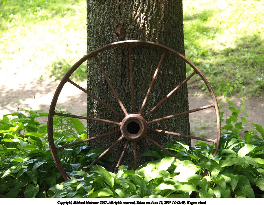 Picture #2: Wagon wheel Thumb: 456x342, 55,720 bytes (55K) Small: 912x707, 157,769 bytes (155K), (html file) Copyright, Michael Meissner 2007, All rights reserved Olympus E-510 camera with Olympus 14-54mm f/2.8-3.5 lens f/3.5, ISO 100, 1/125 sec, 54.0mm, auto mode, vivid color, SHQ, matrix metering, -2 sharpening, image stabilization 35mm equivalent focal length 108.0mm Taken by Michael Meissner on June 16, 2007 14:43:49 Last modified on June 16, 2007 at 14:43 |