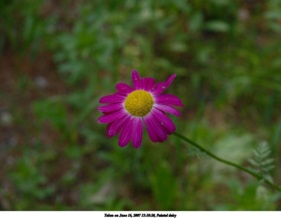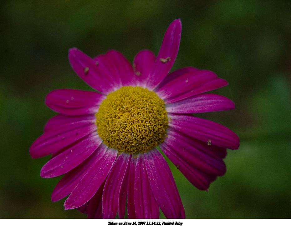 Picture #15: Painted daisy Thumb: 465x350, 42,150 bytes (42K) Small: 930x723, 81,673 bytes (80K), (html file) Olympus E-510 camera with Olympus 14-54mm lens f/4.5, ISO 400, 1/250 sec, 52.0mm, shutter priority, matrix metering, -1 sharpening 35mm equivalent focal length 104.0mm Programs used: RAW, gimp Taken by Michael Meissner on June 16, 2007 15:10:20 Last modified on June 16, 2007 at 15:10 |