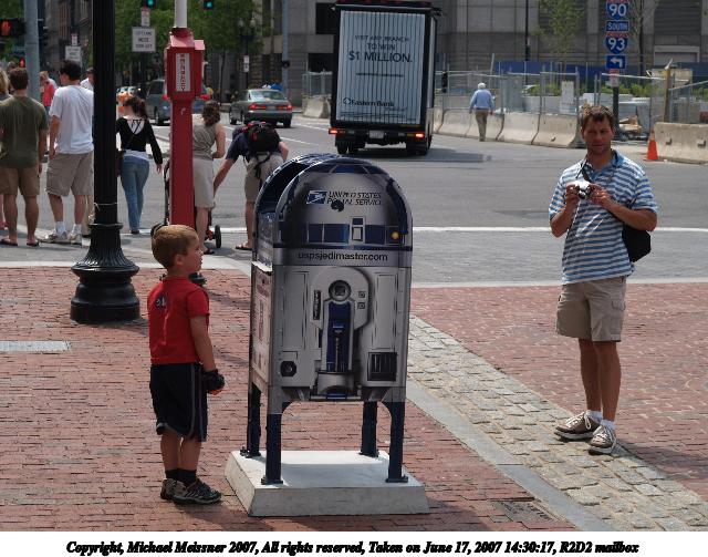 Picture #3: R2D2 mailbox Thumb: 320x240, 30,163 bytes (30K) Small: 640x503, 83,046 bytes (82K), (html file) Copyright, Michael Meissner 2007, All rights reserved Olympus E-1 camera with Olympus 14-54mm f/2.8-3.5 lens f/5.6, ISO 100, 1/400 sec, 41.0mm, auto mode, SHQ, matrix metering, +2 sharpening 35mm equivalent focal length 82.0mm Taken by Michael Meissner on June 17, 2007 14:30:17 Last modified on June 17, 2007 at 14:30 |