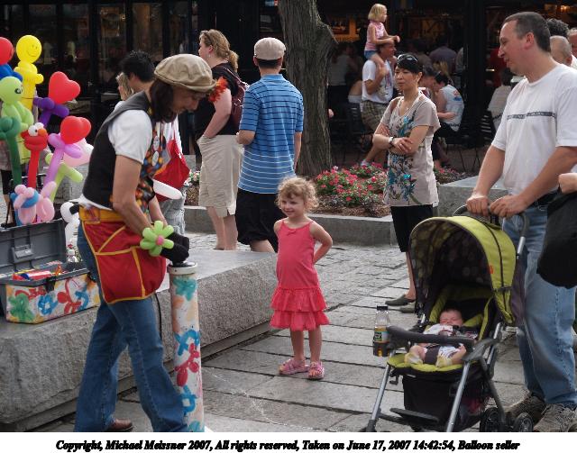 Picture #3: Balloon seller Thumb: 320x240, 33,024 bytes (33K) Small: 640x503, 83,101 bytes (82K), (html file) Copyright, Michael Meissner 2007, All rights reserved Olympus E-1 camera with Olympus 14-54mm f/2.8-3.5 lens f/3.3, ISO 100, 1/125 sec, 37.0mm, auto mode, SHQ, matrix metering, +2 sharpening 35mm equivalent focal length 74.0mm Taken by Michael Meissner on June 17, 2007 14:42:54 Last modified on June 17, 2007 at 14:42 |