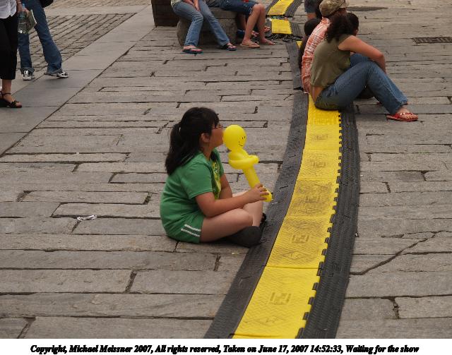 Picture #4: Waiting for the show Thumb: 320x240, 27,542 bytes (27K) Small: 640x503, 76,196 bytes (75K), (html file) Copyright, Michael Meissner 2007, All rights reserved Olympus E-1 camera with Olympus 14-54mm f/2.8-3.5 lens f/4.5, ISO 100, 1/320 sec, 46.0mm, auto mode, SHQ, manual wb, matrix metering, +2 sharpening 35mm equivalent focal length 92.0mm Taken by Michael Meissner on June 17, 2007 14:52:33 Last modified on June 17, 2007 at 14:52 |
