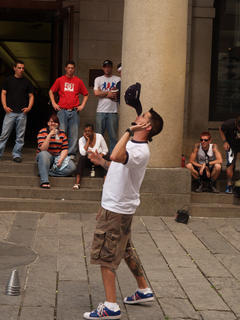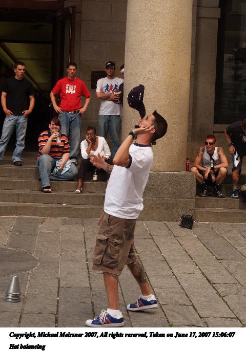 Picture #7: Hat balancing Thumb: 240x320, 28,467 bytes (28K) Small: 480x686, 72,807 bytes (72K), (html file) Copyright, Michael Meissner 2007, All rights reserved Olympus E-1 camera with Olympus 14-54mm f/2.8-3.5 lens f/5.6, ISO 200, 1/400 sec, 44.0mm, auto mode, SHQ, manual wb, matrix metering, +2 sharpening 35mm equivalent focal length 88.0mm Programs used: rotate Taken by Michael Meissner on June 17, 2007 15:06:07 Last modified on June 17, 2007 at 15:06 |
