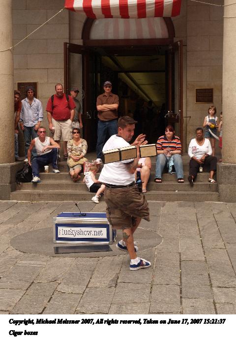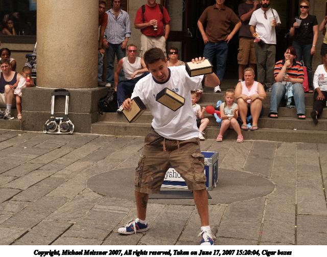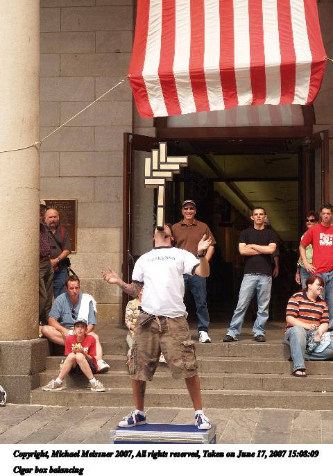 Picture #8: Cigar box balancing Thumb: 240x320, 31,561 bytes (31K) Small: 480x686, 76,503 bytes (75K), (html file) Copyright, Michael Meissner 2007, All rights reserved Olympus E-1 camera with Olympus 14-54mm f/2.8-3.5 lens f/5.0, ISO 200, 1/320 sec, 42.0mm, auto mode, SHQ, manual wb, matrix metering, +2 sharpening 35mm equivalent focal length 84.0mm Programs used: rotate Taken by Michael Meissner on June 17, 2007 15:08:09 Last modified on June 17, 2007 at 15:08 |