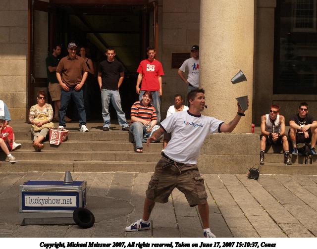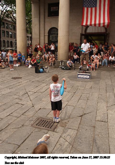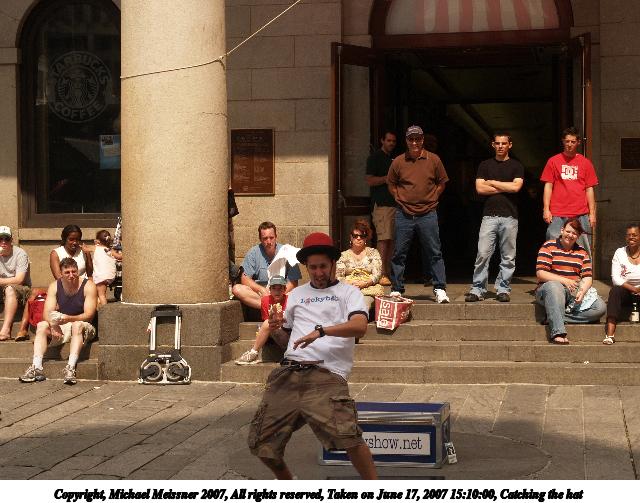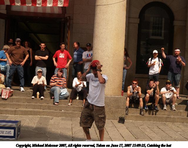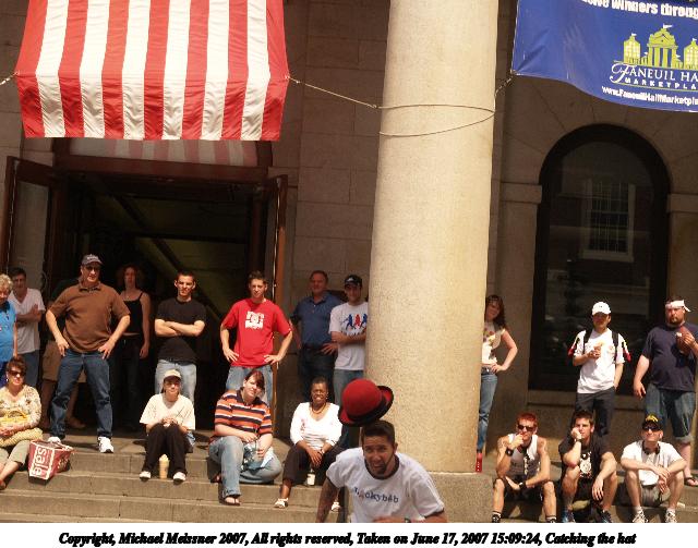 Picture #10: Catching the hat Thumb: 320x240, 29,430 bytes (29K) Small: 640x503, 79,554 bytes (78K), (html file) Copyright, Michael Meissner 2007, All rights reserved Olympus E-1 camera with Olympus 14-54mm f/2.8-3.5 lens f/7.1, ISO 200, 1/640 sec, 37.0mm, auto mode, SHQ, manual wb, matrix metering, +2 sharpening 35mm equivalent focal length 74.0mm Taken by Michael Meissner on June 17, 2007 15:09:17 Last modified on June 17, 2007 at 15:09 |
