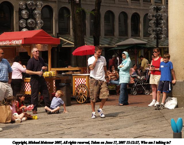 Picture #19: Who am I talking to? Thumb: 320x240, 31,743 bytes (31K) Small: 640x503, 86,569 bytes (85K), (html file) Copyright, Michael Meissner 2007, All rights reserved Olympus E-1 camera with Olympus 14-54mm f/2.8-3.5 lens f/6.3, ISO 200, 1/640 sec, 52.0mm, auto mode, SHQ, manual wb, matrix metering, +2 sharpening 35mm equivalent focal length 104.0mm Taken by Michael Meissner on June 17, 2007 15:12:27 Last modified on June 17, 2007 at 15:12 |