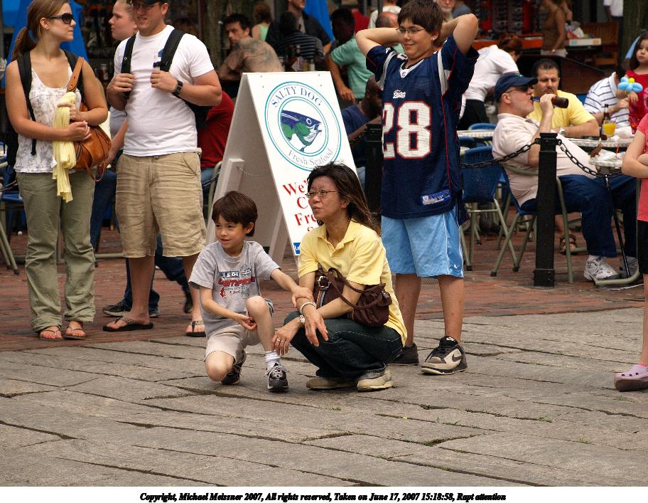 Picture #22: Rapt attention Thumb: 456x342, 54,799 bytes (54K) Small: 912x707, 157,812 bytes (155K), (html file) Copyright, Michael Meissner 2007, All rights reserved Olympus E-510 camera with Olympus 40-150mm f/4.0-5.6 lens f/6.3, ISO 200, 1/320 sec, 86.0mm, auto mode, vivid color, SHQ, manual wb, matrix metering, -2 sharpening, image stabilization 35mm equivalent focal length 172.0mm Taken by Michael Meissner on June 17, 2007 15:18:58 Last modified on June 17, 2007 at 15:18 |