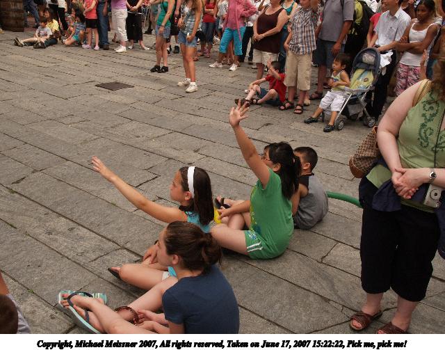 Picture #25: Pick me, pick me! Thumb: 320x240, 30,657 bytes (30K) Small: 640x503, 84,400 bytes (83K), (html file) Copyright, Michael Meissner 2007, All rights reserved Olympus E-1 camera with Olympus 14-54mm f/2.8-3.5 lens f/7.1, ISO 200, 1/320 sec, 17.0mm, auto mode, SHQ, manual wb, matrix metering, +2 sharpening 35mm equivalent focal length 34.0mm Taken by Michael Meissner on June 17, 2007 15:22:22 Last modified on June 17, 2007 at 15:22 |