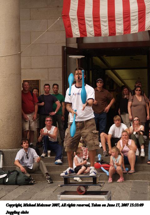 Picture #27: Juggling clubs Thumb: 240x320, 32,003 bytes (32K) Small: 480x686, 73,400 bytes (72K), (html file) Copyright, Michael Meissner 2007, All rights reserved Olympus E-1 camera with Olympus 14-54mm f/2.8-3.5 lens f/5.0, ISO 200, 1/320 sec, 43.0mm, auto mode, SHQ, manual wb, matrix metering, +2 sharpening 35mm equivalent focal length 86.0mm Programs used: rotate Taken by Michael Meissner on June 17, 2007 15:33:09 Last modified on June 17, 2007 at 15:33 |