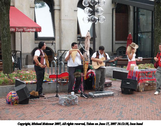 Picture #30: Inca band Thumb: 320x240, 31,711 bytes (31K) Small: 640x503, 88,320 bytes (87K), (html file) Copyright, Michael Meissner 2007, All rights reserved Olympus E-1 camera with Olympus 14-54mm f/2.8-3.5 lens f/3.5, ISO 200, 1/160 sec, 38.0mm, auto mode, SHQ, matrix metering, +2 sharpening 35mm equivalent focal length 76.0mm Taken by Michael Meissner on June 17, 2007 16:12:38 Last modified on June 17, 2007 at 16:12 |