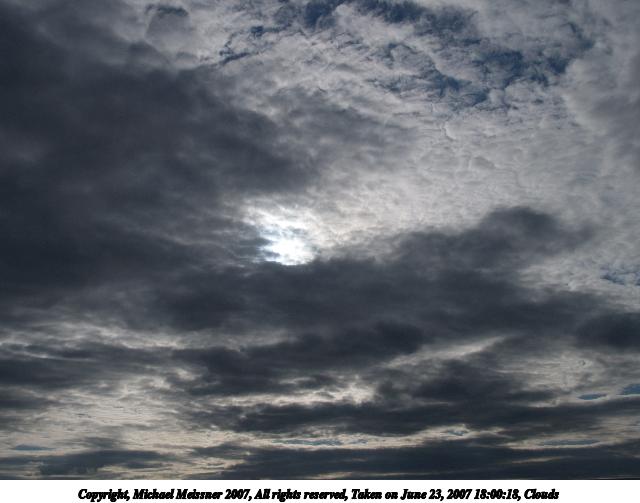 Picture #78: Clouds #7 Thumb: 400x300, 49,713 bytes (49K) Small: 800x623, 121,712 bytes (119K), (html file) Copyright, Michael Meissner 2007, All rights reserved Olympus E-510 camera with Olympus 11-22mm f/2.8-3.5 lens f/11.0, ISO 200, 1/800 sec, 12.0mm, auto mode, vivid color, SHQ, manual wb, center weight metering, -2 sharpening, image stabilization, exposure bracketing (shot 1) 35mm equivalent focal length 24.0mm Programs used: gimp Taken by Michael Meissner on June 23, 2007 18:18:39 Last modified on June 23, 2007 at 18:18 This picture is one of my favorites. |