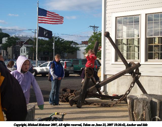 Picture #87: Anchor and kids Thumb: 320x240, 39,235 bytes (39K) Small: 640x503, 86,964 bytes (85K), (html file) Copyright, Michael Meissner 2007, All rights reserved Olympus E-1 camera with Olympus 14-54mm f/2.8-3.5 lens f/6.3, ISO 100, 1/320 sec, 29.0mm, auto mode, SHQ, matrix metering, +2 sharpening 35mm equivalent focal length 58.0mm Taken by Michael Meissner on June 23, 2007 18:26:42 Last modified on June 23, 2007 at 18:26 |