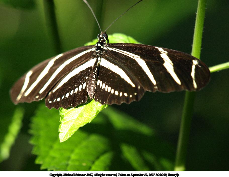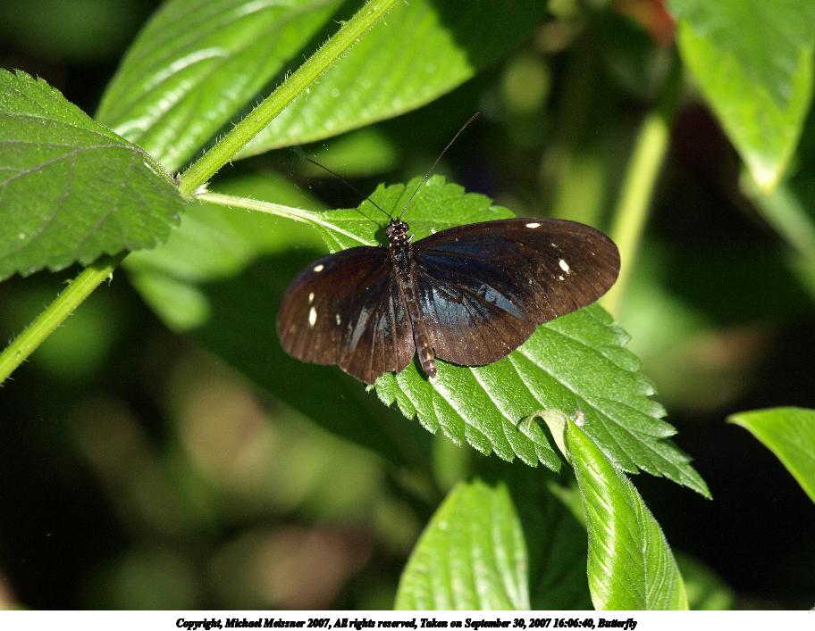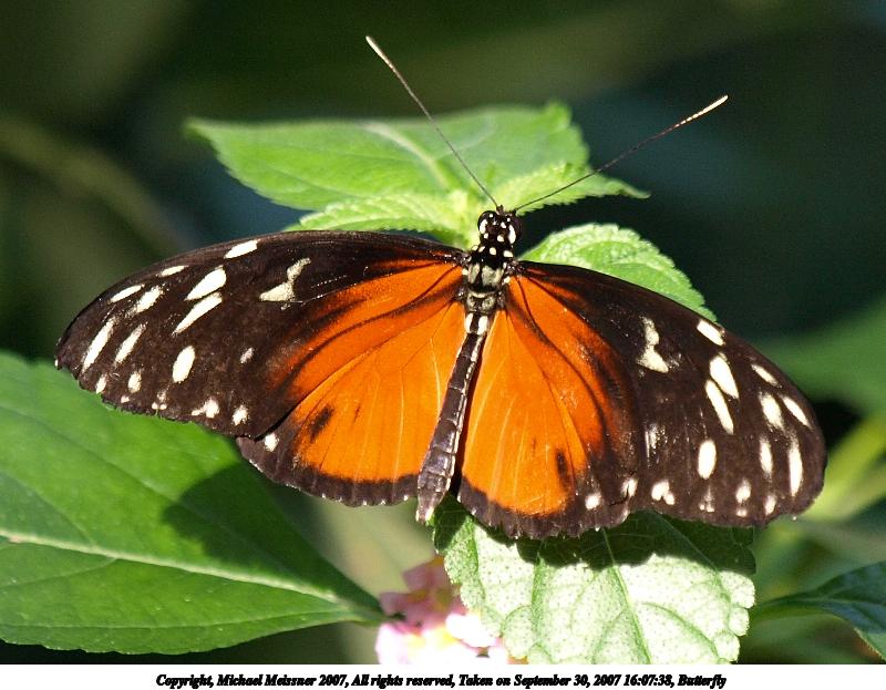 Picture #9: Butterfly #9 Thumb: 456x342, 33,272 bytes (33K) Small: 912x707, 80,916 bytes (80K), (html file) Copyright, Michael Meissner 2007, All rights reserved Olympus E-510 camera with Olympus 50-200mm f/2.8-3.5 lens f/4.0, ISO 400, 1/320 sec, 147.0mm, auto mode, natural color, SHQ, matrix metering, auto + manual focus, image stabilization, noise filter low 35mm equivalent focal length 295.0mm Extra equipment used: FL-50 flash Taken by Michael Meissner on September 30, 2007 16:06:35 Last modified on September 30, 2007 at 16:06 This picture is one of my favorites. |
