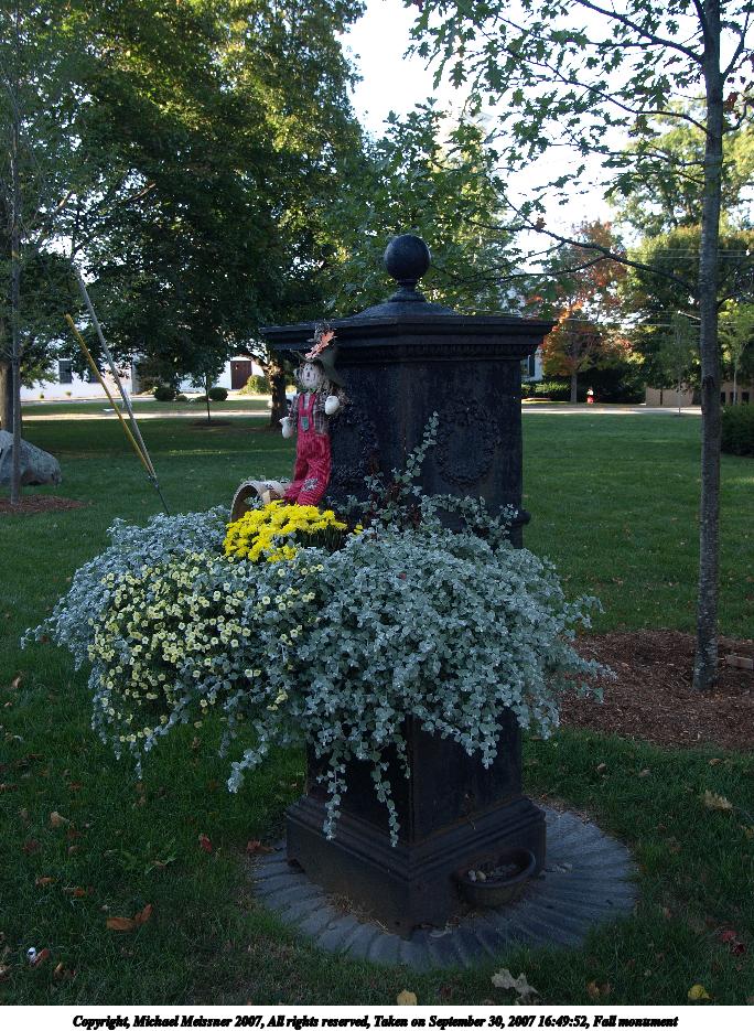 Picture #6: Fall monument Thumb: 342x456, 63,815 bytes (63K) Small: 684x935, 202,697 bytes (198K), (html file) Copyright, Michael Meissner 2007, All rights reserved Olympus E-510 camera with Olympus 11-22mm f/2.8-3.5 lens f/4.5, ISO 100, 1/80 sec, 17.0mm, auto mode, natural color, SHQ, matrix metering, auto + manual focus, image stabilization, noise filter low 35mm equivalent focal length 34.0mm Programs used: rotate Taken by Michael Meissner on September 30, 2007 16:49:52 Last modified on September 30, 2007 at 16:49 |