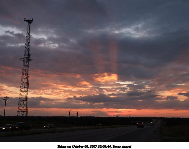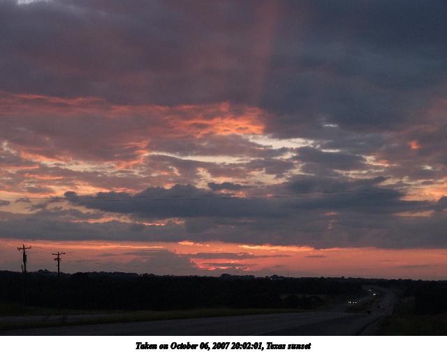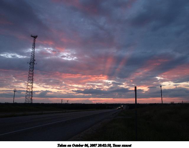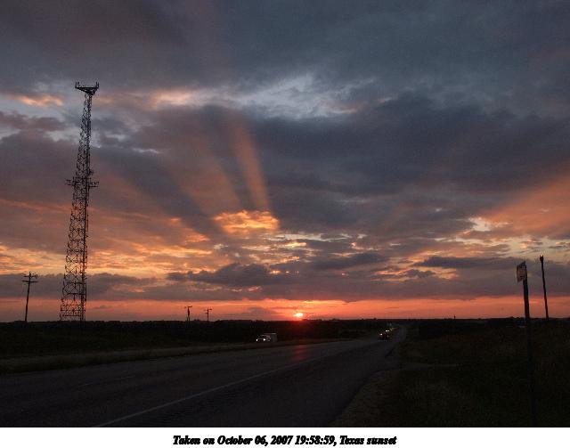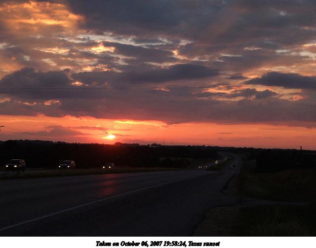 Picture #2: Texas sunset #2 Thumb: 320x240, 21,390 bytes (21K) Small: 640x503, 41,035 bytes (41K), (html file) Olympus E-1 camera with Olympus 14-54mm f/2.8-3.5 lens f/5.0, ISO 100, 1/125 sec, 14.0mm, auto mode, SHQ, spot metering, bias -1.3, +2 sharpening, Exposure bracketing (shot 2) 35mm equivalent focal length 28.0mm Programs used: gimp Taken by Michael Meissner on October 06, 2007 19:58:31 Last modified on October 06, 2007 at 19:58 This picture is one of my favorites. |