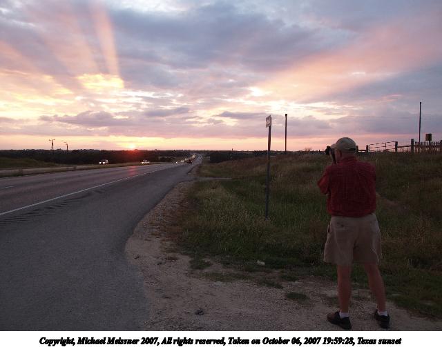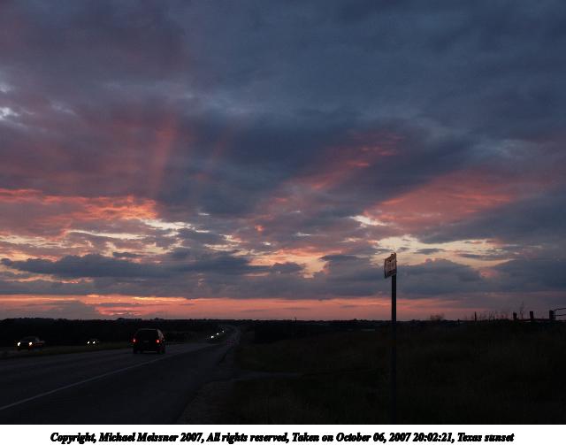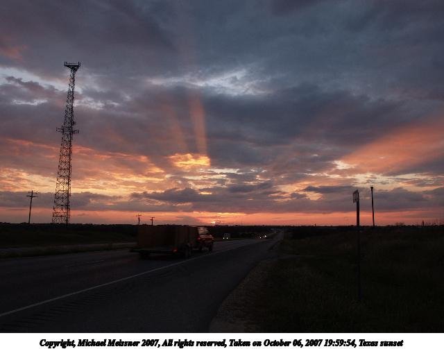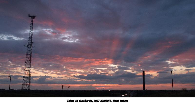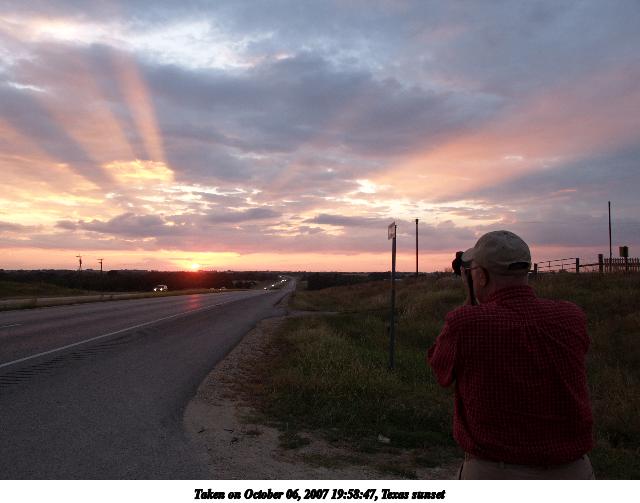 Picture #11: Texas sunset #11 Thumb: 320x240, 18,847 bytes (19K) Small: 640x503, 37,810 bytes (37K), (html file) Copyright, Michael Meissner 2007, All rights reserved Olympus E-1 camera with Olympus 14-54mm f/2.8-3.5 lens f/4.0, ISO 100, 1/80 sec, 20.0mm, auto mode, SHQ, spot metering, bias -0.7, +2 sharpening, Exposure bracketing (shot 3) 35mm equivalent focal length 40.0mm Taken by Michael Meissner on October 06, 2007 20:02:21 Last modified on October 06, 2007 at 20:02 |