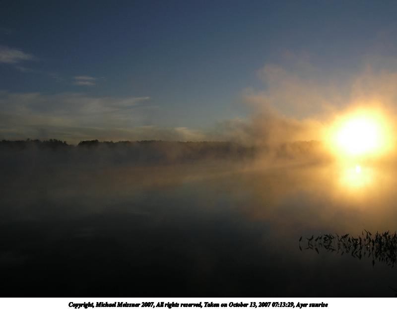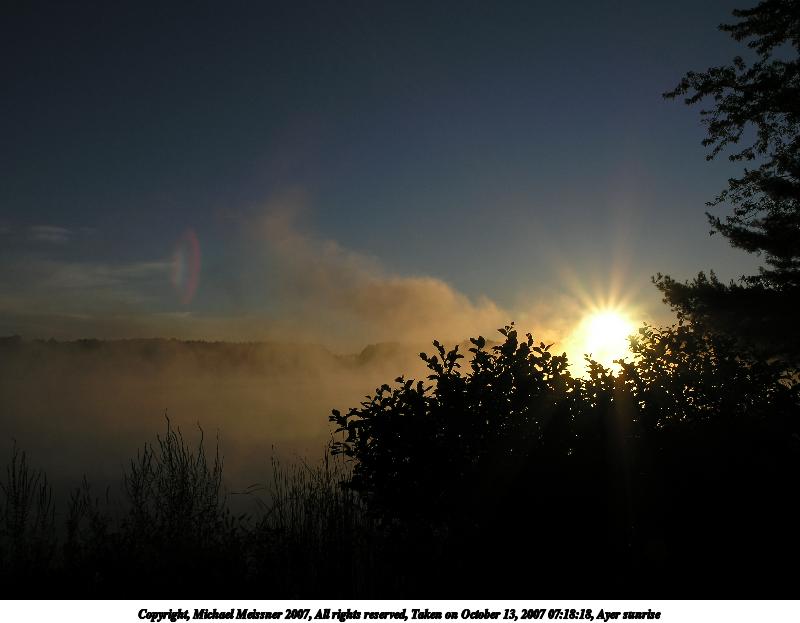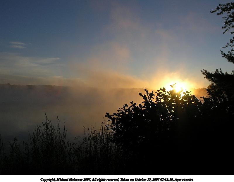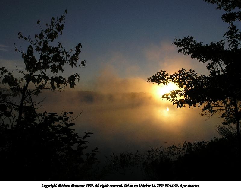 Picture #3: Ayer sunrise #3 Thumb: 400x300, 22,937 bytes (23K) Small: 800x623, 64,883 bytes (64K), (html file) Copyright, Michael Meissner 2007, All rights reserved Olympus C-8080WZ camera f/7.1, ISO 50, 1/640 sec, 7.1mm, auto mode, SHQ, spot metering, bias -0.7 35mm equivalent focal length 28.0mm Programs used: gimp Taken by Michael Meissner on October 13, 2007 07:13:05 Last modified on October 13, 2007 at 07:13 This picture is one of my favorites. |