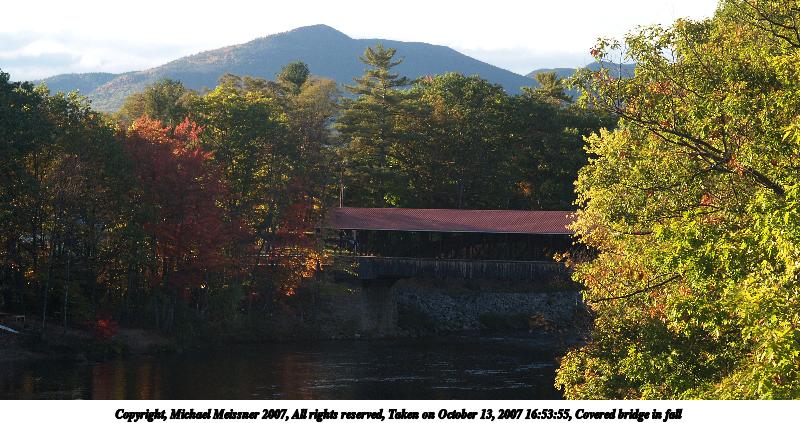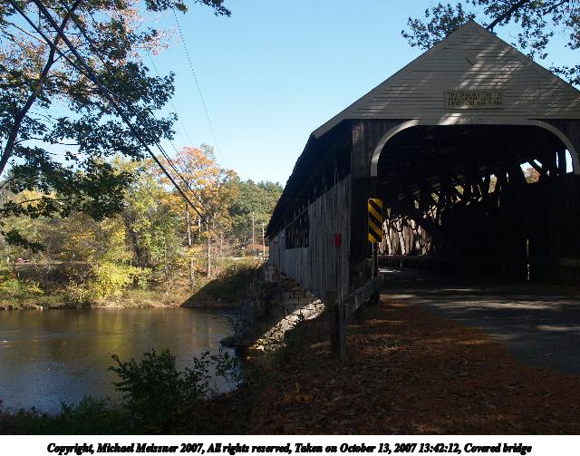 Picture #16: Covered bridge Thumb: 320x240, 31,831 bytes (32K) Small: 640x503, 89,157 bytes (88K), (html file) Copyright, Michael Meissner 2007, All rights reserved Olympus E-1 camera with Olympus 14-54mm f/2.8-3.5 lens f/4.5, ISO 100, 1/100 sec, 17.0mm, auto mode, SHQ, matrix metering, +2 sharpening, Exposure bracketing (shot 1) 35mm equivalent focal length 34.0mm Extra equipment used: polarizer Programs used: gimp Taken by Michael Meissner on October 13, 2007 13:42:12 Last modified on October 13, 2007 at 13:42 |