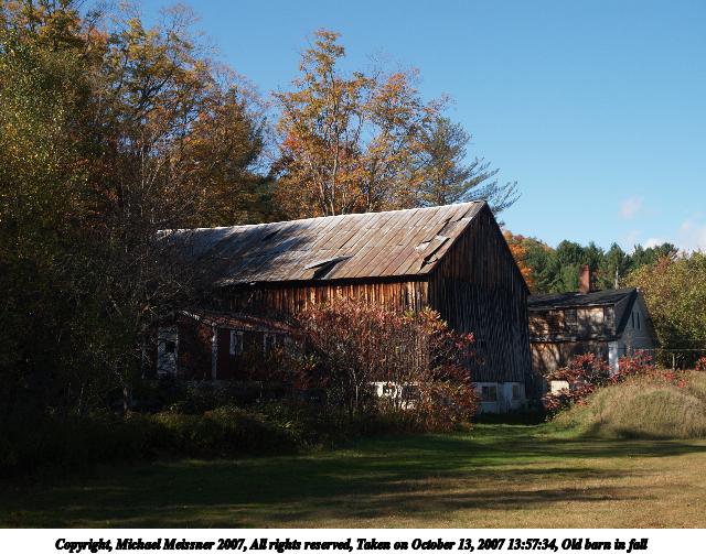 Picture #18: Old barn in fall Thumb: 320x240, 27,248 bytes (27K) Small: 640x503, 84,298 bytes (83K), (html file) Copyright, Michael Meissner 2007, All rights reserved Olympus E-1 camera with Olympus 14-54mm f/2.8-3.5 lens f/5.0, ISO 100, 1/160 sec, 27.0mm, auto mode, SHQ, matrix metering, +2 sharpening, Exposure bracketing (shot 1) 35mm equivalent focal length 54.0mm Extra equipment used: polarizer Taken by Michael Meissner on October 13, 2007 13:57:34 Last modified on October 13, 2007 at 13:57 |