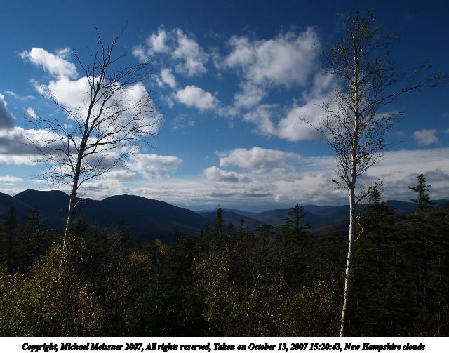 Picture #6: New Hampshire clouds Thumb: 320x240, 25,897 bytes (26K) Small: 640x503, 76,418 bytes (75K), (html file) Copyright, Michael Meissner 2007, All rights reserved Olympus E-1 camera with Olympus 14-54mm f/2.8-3.5 lens f/5.6, ISO 100, 1/160 sec, 14.0mm, auto mode, SHQ, matrix metering, +2 sharpening, Exposure bracketing (shot 1) 35mm equivalent focal length 28.0mm Extra equipment used: polarizer Taken by Michael Meissner on October 13, 2007 15:20:08 Last modified on October 13, 2007 at 15:20 |