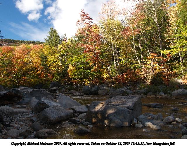 Picture #30: New Hampshire fall #10 Thumb: 480x240, 33,062 bytes (33K) Small: 800x423, 65,270 bytes (64K), (html file) Copyright, Michael Meissner 2007, All rights reserved Olympus E-1 camera with Olympus 14-54mm f/2.8-3.5 lens f/3.5, ISO 200, 1/60 sec, 14.0mm, auto mode, SHQ, matrix metering, bias 0.7, +2 sharpening, Exposure bracketing (shot 4) 35mm equivalent focal length 28.0mm Extra equipment used: polarizer Programs used: gimp Taken by Michael Meissner on October 13, 2007 17:25:26 Last modified on October 13, 2007 at 17:25 |