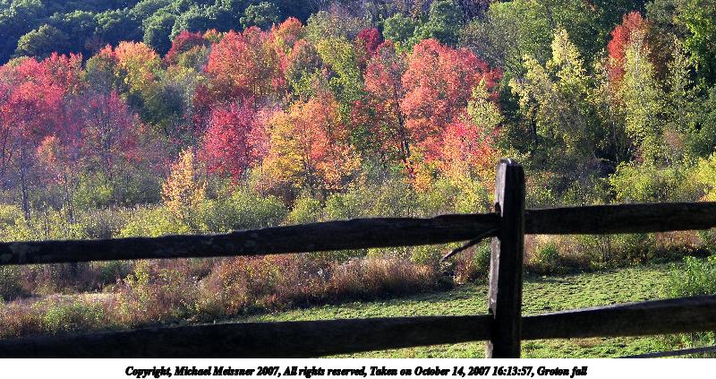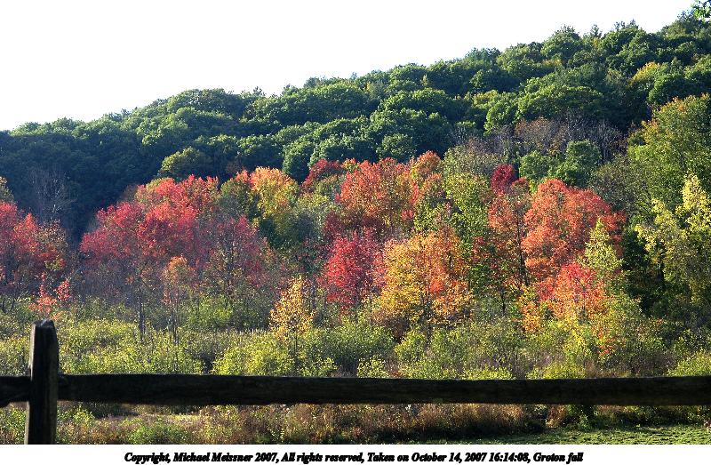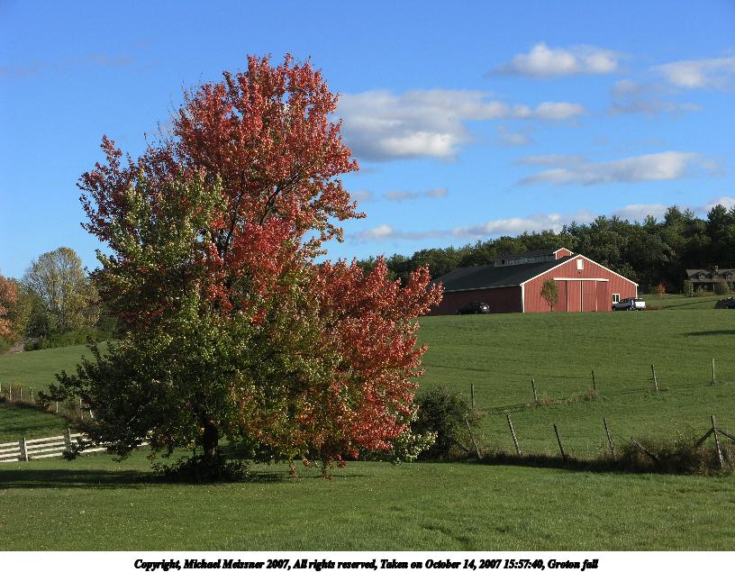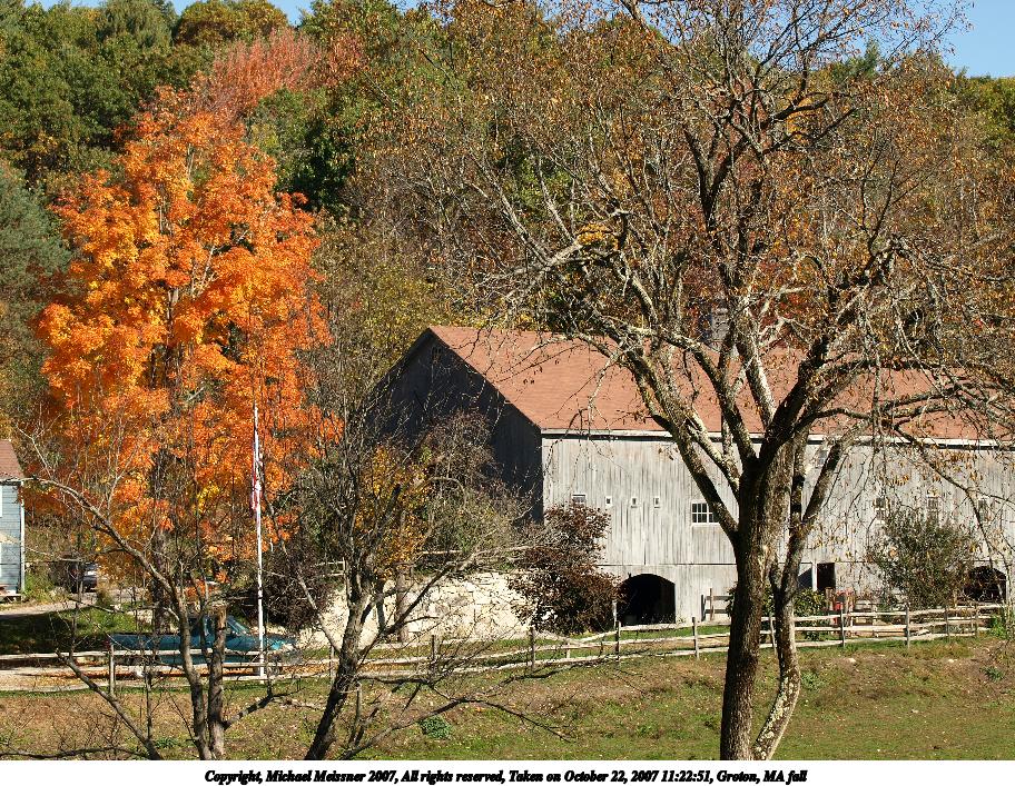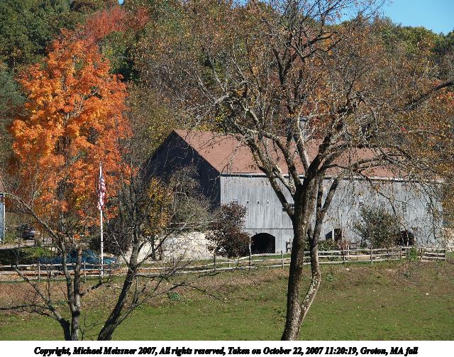 Picture #1: Groton fall Thumb: 408x306, 35,793 bytes (35K) Small: 816x635, 125,890 bytes (123K), (html file) Copyright, Michael Meissner 2007, All rights reserved Olympus C-8080WZ camera f/4.0, ISO 50, 1/400 sec, 20.6mm, auto mode, SHQ, matrix metering 35mm equivalent focal length 81.0mm Programs used: gimp Taken by Michael Meissner on October 14, 2007 15:57:40 Last modified on October 14, 2007 at 15:57 This picture is one of my favorites. |