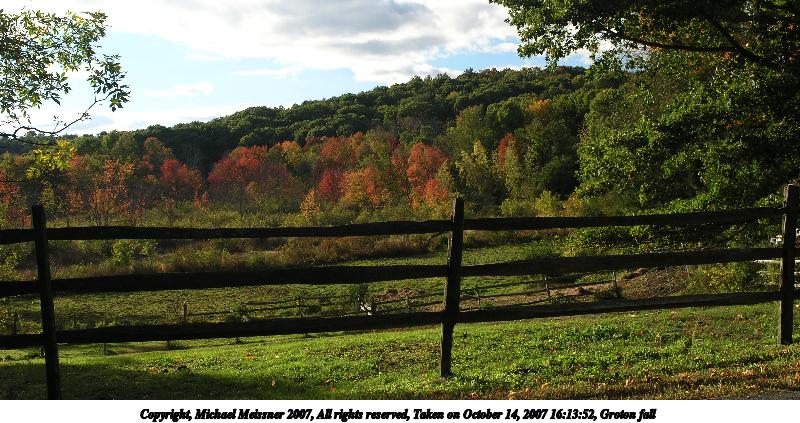 Picture #81: Groton, MA fall #2 Thumb: 456x342, 48,955 bytes (48K) Small: 912x707, 172,836 bytes (169K), (html file) Copyright, Michael Meissner 2007, All rights reserved Olympus E-510 camera with Olympus 50-200mm f/2.8-3.5 lens f/4.0, ISO 100, 1/320 sec, 92.0mm, auto mode, natural color, SHQ, cloudy (6000K), matrix metering, image stabilization, noise filter low, exposure bracketing (shot 1) 35mm equivalent focal length 184.0mm Extra equipment used: polarizer Programs used: gimp Taken by Michael Meissner on October 22, 2007 10:50:38 Last modified on October 22, 2007 at 10:50 This picture is one of my favorites. |