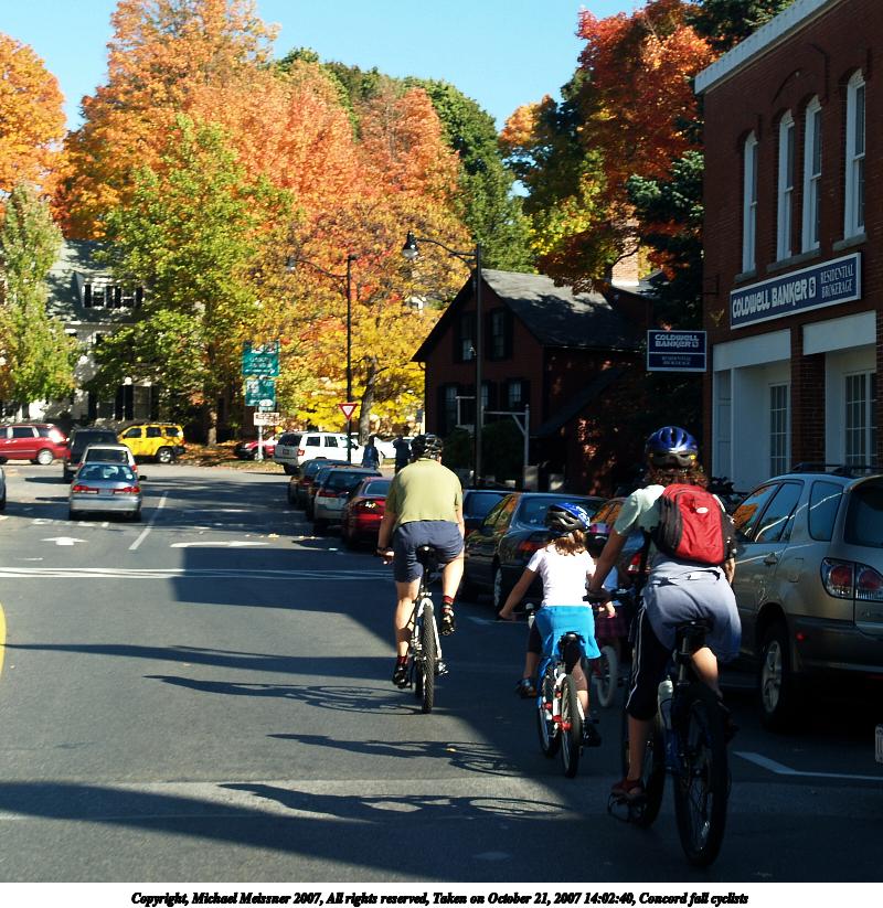 Picture #38: Concord fall cyclists Thumb: 400x400, 62,462 bytes (61K) Small: 800x823, 156,700 bytes (154K), (html file) Copyright, Michael Meissner 2007, All rights reserved Olympus E-1 camera with Olympus 14-54mm f/2.8-3.5 lens f/4.0, ISO 100, 1/100 sec, 28.0mm, auto mode, SHQ, matrix metering, +2 sharpening 35mm equivalent focal length 56.0mm Extra equipment used: polarizer Programs used: gimp Taken by Michael Meissner on October 21, 2007 14:02:40 Last modified on October 21, 2007 at 14:02 |