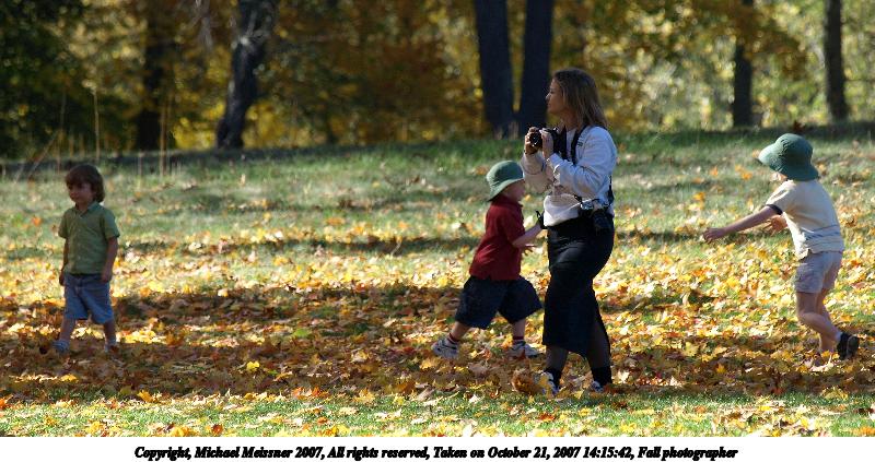 Picture #60: Fall photographer Thumb: 400x200, 43,562 bytes (43K) Small: 800x423, 103,430 bytes (102K), (html file) Copyright, Michael Meissner 2007, All rights reserved Olympus E-510 camera with Olympus 50-200mm f/2.8-3.5 lens f/4.5, ISO 100, 1/320 sec, 200.0mm, auto mode, natural color, SHQ, matrix metering, image stabilization, noise filter low 35mm equivalent focal length 401.0mm Extra equipment used: polarizer Programs used: gimp Taken by Michael Meissner on October 21, 2007 14:15:42 Last modified on October 21, 2007 at 14:15 |
