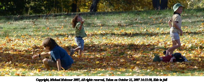 Picture #63: Kids in fall #3 Thumb: 456x342, 59,088 bytes (58K) Small: 912x707, 171,277 bytes (168K), (html file) Copyright, Michael Meissner 2007, All rights reserved Olympus E-510 camera with Olympus 50-200mm f/2.8-3.5 lens f/4.0, ISO 100, 1/250 sec, 200.0mm, auto mode, natural color, SHQ, matrix metering, image stabilization, noise filter low 35mm equivalent focal length 401.0mm Extra equipment used: polarizer Taken by Michael Meissner on October 21, 2007 14:31:05 Last modified on October 21, 2007 at 14:31 |