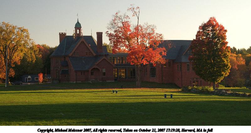 Picture #53: Harvard, MA in fall #2 Thumb: 480x320, 39,597 bytes (39K) Small: 800x556, 92,712 bytes (91K), (html file) Copyright, Michael Meissner 2007, All rights reserved Olympus E-1 camera with Olympus 14-54mm f/2.8-3.5 lens f/6.3, ISO 400, 1/160 sec, 14.0mm, auto mode, SHQ, matrix metering, bias 0.7, +2 sharpening, Exposure bracketing (shot 4) 35mm equivalent focal length 28.0mm Extra equipment used: polarizer Programs used: NoiseNinja, gimp Taken by Michael Meissner on October 21, 2007 17:23:34 Last modified on October 21, 2007 at 17:23 |