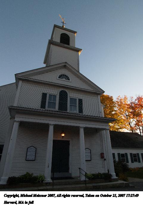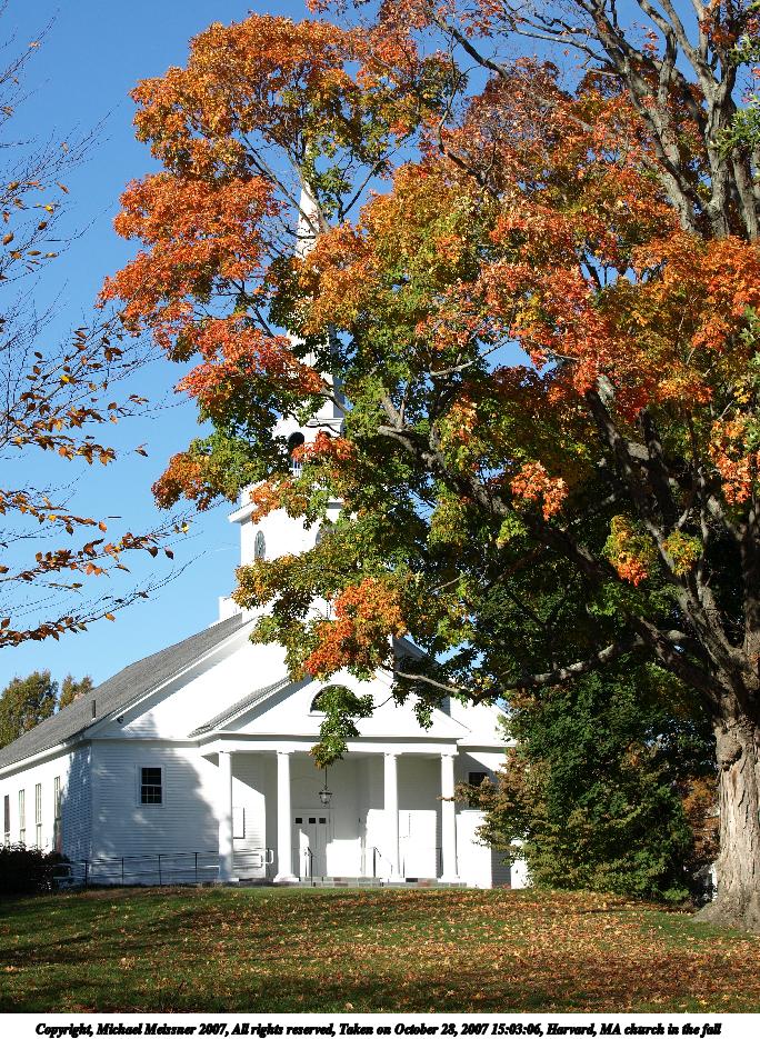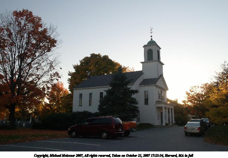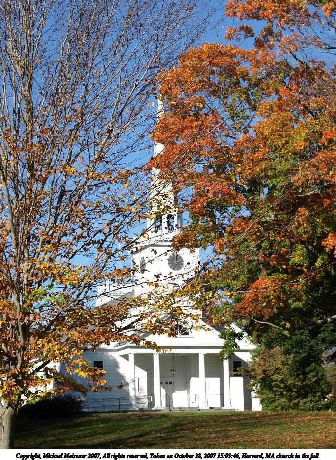 Picture #96: Harvard, MA church in the fall Thumb: 342x456, 82,170 bytes (81K) Small: 684x935, 260,347 bytes (255K), (html file) Copyright, Michael Meissner 2007, All rights reserved Olympus E-510 camera with Olympus 50-200mm f/2.8-3.5 lens f/5.6, ISO 100, 1/500 sec, 50.0mm, auto mode, natural color, SHQ, matrix metering, auto + manual focus, image stabilization, noise reduction, noise filter low 35mm equivalent focal length 100.0mm Programs used: rotate Taken by Michael Meissner on October 28, 2007 15:03:06 Last modified on October 28, 2007 at 15:03 |