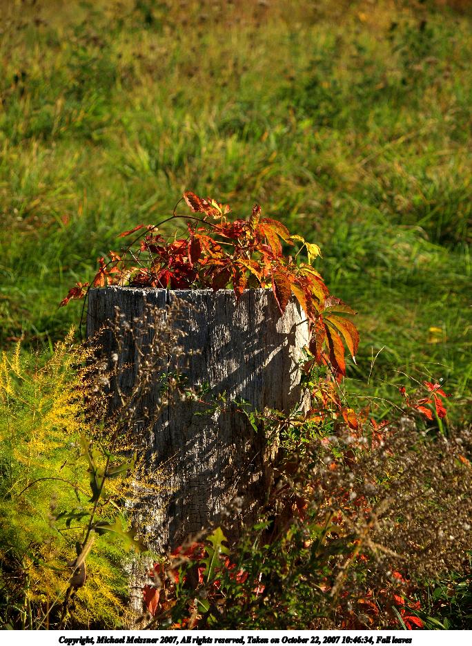 Picture #77: Leaves and stone walls Thumb: 456x342, 72,217 bytes (71K) Small: 912x707, 231,296 bytes (226K), (html file) Copyright, Michael Meissner 2007, All rights reserved Olympus E-510 camera with Olympus 50-200mm f/2.8-3.5 lens f/3.5, ISO 100, 1/250 sec, 108.0mm, auto mode, natural color, SHQ, cloudy (6000K), matrix metering, image stabilization, noise filter low, exposure bracketing (shot 1) 35mm equivalent focal length 216.0mm Extra equipment used: polarizer Programs used: gimp Taken by Michael Meissner on October 22, 2007 10:45:36 Last modified on October 22, 2007 at 10:45 |
