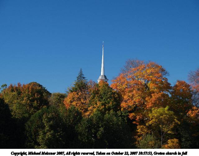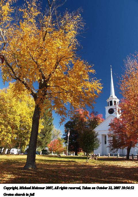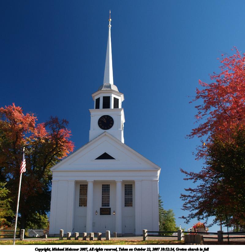 Picture #89: Groton church in fall #3 Thumb: 240x320, 43,158 bytes (43K) Small: 480x686, 123,952 bytes (122K), (html file) Copyright, Michael Meissner 2007, All rights reserved Olympus E-1 camera with Olympus 14-54mm f/2.8-3.5 lens f/4.5, ISO 100, 1/80 sec, 14.0mm, auto mode, SHQ, matrix metering, +2 sharpening, Exposure bracketing (shot 1) 35mm equivalent focal length 28.0mm Extra equipment used: polarizer Programs used: rotate Taken by Michael Meissner on October 22, 2007 10:54:52 Last modified on October 22, 2007 at 10:54 This picture is one of my favorites. |