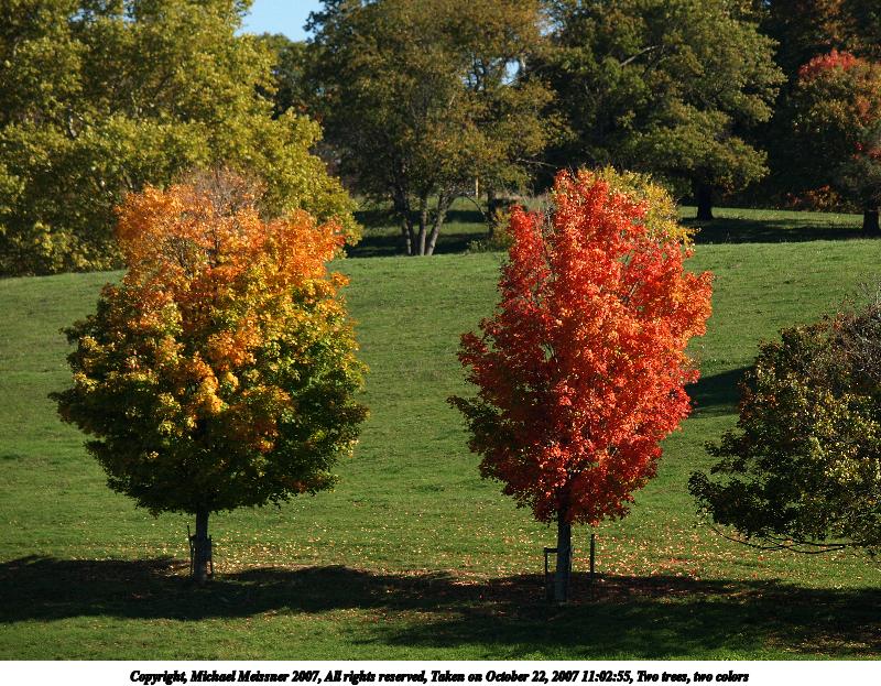 Picture #83: Two trees, two colors Thumb: 400x300, 55,130 bytes (54K) Small: 800x623, 163,794 bytes (160K), (html file) Copyright, Michael Meissner 2007, All rights reserved Olympus E-510 camera with Olympus 50-200mm f/2.8-3.5 lens f/4.5, ISO 100, 1/500 sec, 130.0mm, auto mode, natural color, SHQ, cloudy (6000K), matrix metering, bias -0.7, image stabilization, noise filter low, exposure bracketing (shot 2) 35mm equivalent focal length 260.0mm Extra equipment used: polarizer Programs used: gimp Taken by Michael Meissner on October 22, 2007 11:02:55 Last modified on October 22, 2007 at 11:02 |