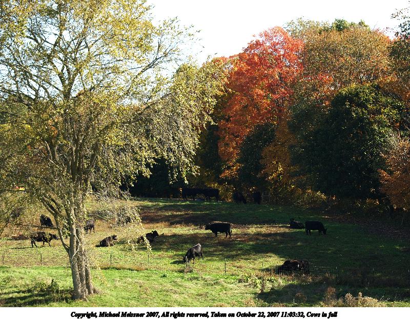Picture #84: Cows in fall Thumb: 400x300, 59,065 bytes (58K) Small: 800x623, 202,115 bytes (198K), (html file) Copyright, Michael Meissner 2007, All rights reserved Olympus E-510 camera with Olympus 50-200mm f/2.8-3.5 lens f/4.0, ISO 100, 1/250 sec, 67.0mm, auto mode, natural color, SHQ, cloudy (6000K), matrix metering, image stabilization, noise filter low, exposure bracketing (shot 1) 35mm equivalent focal length 134.0mm Extra equipment used: polarizer Programs used: gimp Taken by Michael Meissner on October 22, 2007 11:03:32 Last modified on October 22, 2007 at 11:03 |