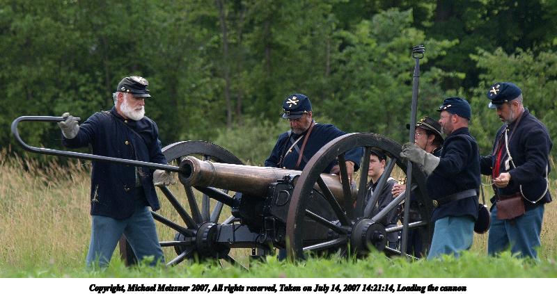 Picture #45: Loading the cannon 800x423, 78,716 bytes (77K), (html file) Copyright, Michael Meissner 2007, All rights reserved Olympus E-510 camera with Olympus 50-200mm f/2.8-3.5 lens and Olympus EC-14 (1.4x) f/4.5, ISO 100, 1/250 sec, 165.0mm, auto mode, natural color, SHQ, matrix metering, -2 sharpening, image stabilization 35mm equivalent focal length 331.0mm, EC-14 Programs used: gimp Taken by Michael Meissner on July 14, 2007 14:21:14 Last modified on July 14, 2007 at 14:21 |